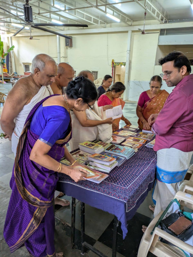 We had a wonderful koyil.org pracharam at Sri Lakshmi Varaha Venkateshwara Temple, Ittamadu, Bangalore . The temple celebrated Azhwar Moksham, and Guru Vidhushi Smt Yamuna Ramapriya shared insightful talks on Thiruvaimozhi and Thiruppavai pasurams. Highlights included the launch of a book ‘Srinivasa Kalyana in Rangoli Art’ compiled by Smt Shobha and a soulful parayanam of Thiruvaimozhi last centum. The event was attended by many and was a great sathsang. We had put up book stall displaying several koyilorg books in specific genre related to azhwar moksham such as, nammazhwar vaibhavam, azhwarthirunagari Vaibhavam, gnana dhanam set in all languages. koyil.org kannada books received good attention. Nammazhwar Vaibhavam in Kannada sold out! Colouring book set was a super hit!.Nammazhvar’s Tiru Adi Tozhal was followed by a sumptuous lunch.